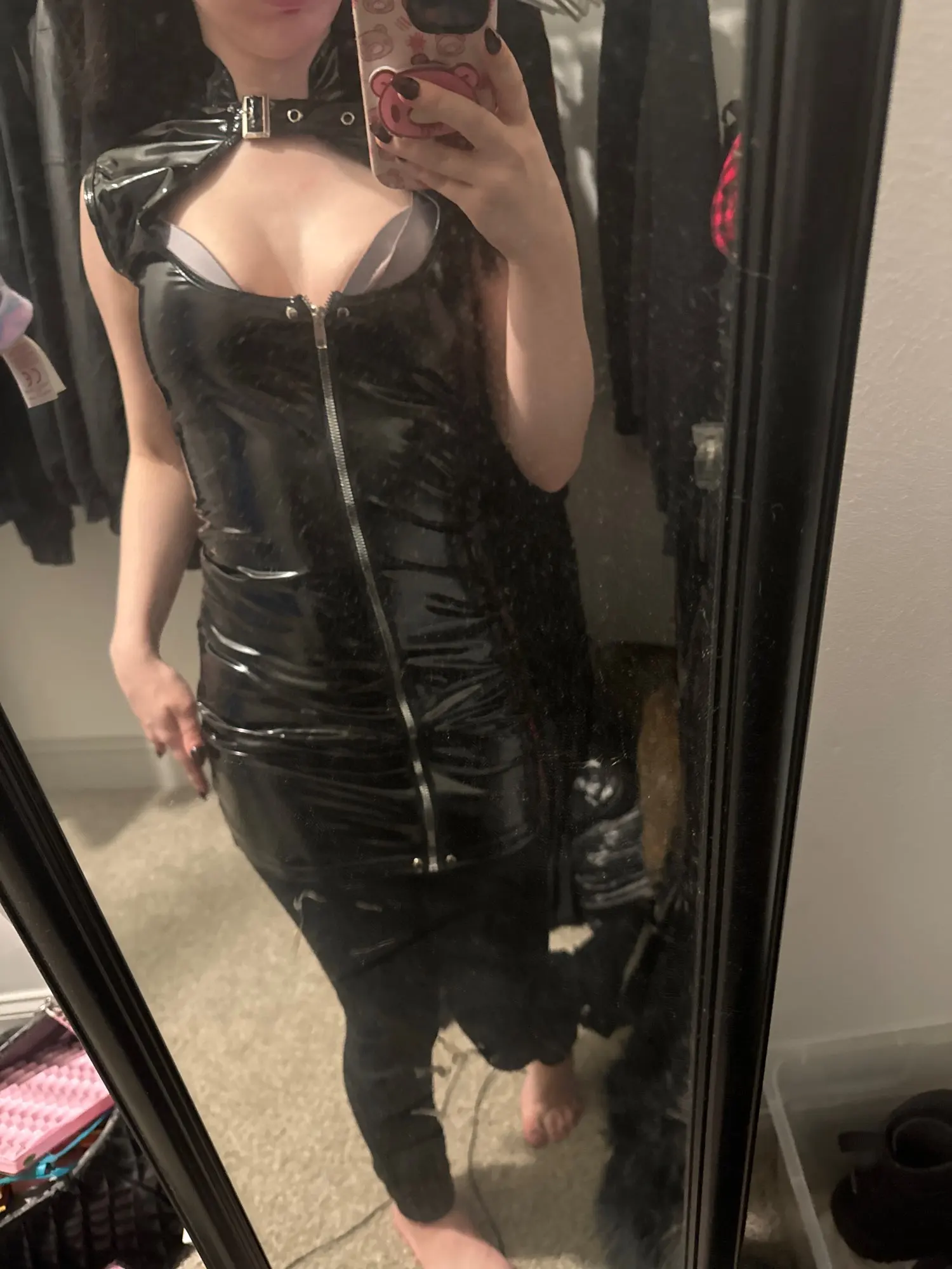 | Highlights: | Sexy open crotch shiny leather dress |